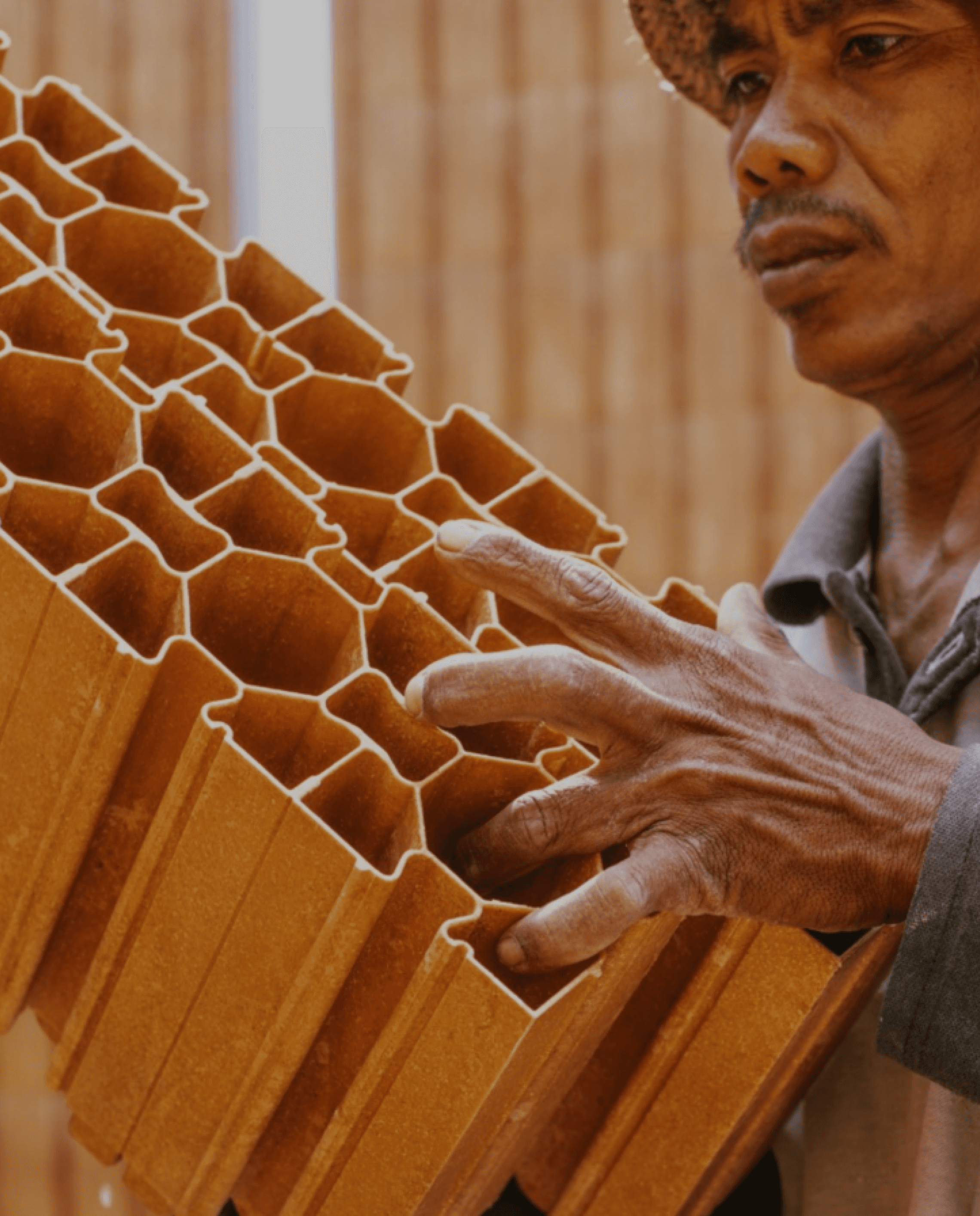 We convert reclaimed plastic and biowaste into a patented building solution that is: